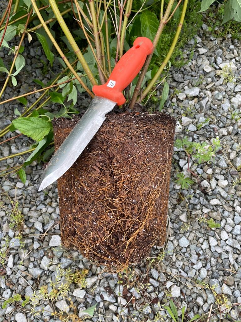 4. Prepare the Root Ball – For a container-grown tree, you’ll want to gently tap the container off the root ball so you can inspect the roots. And this is the hard part – you’ll want to beat the living Bejezus out of the outer inch or so of that root ball. Really. Roots tend to circle along the inside surface of the container and if you don’t break up that circling mass, you’ll end up with a wadded mess of roots somewhere down the road, and a tree that will prematurely fail. A soil knife or utility knife does the trick nicely. Four or 5 vertical slits the length of the root mass, evenly spaced around the ball.